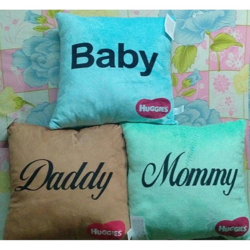 GỐI TỰA LƯNG GIA ĐÌNH HUGGIESCó 3 mẫu gối: " Daddy" với màu nâu, "Mommy" với màu xanh ngọc, "Baby" với màu xanh da trời