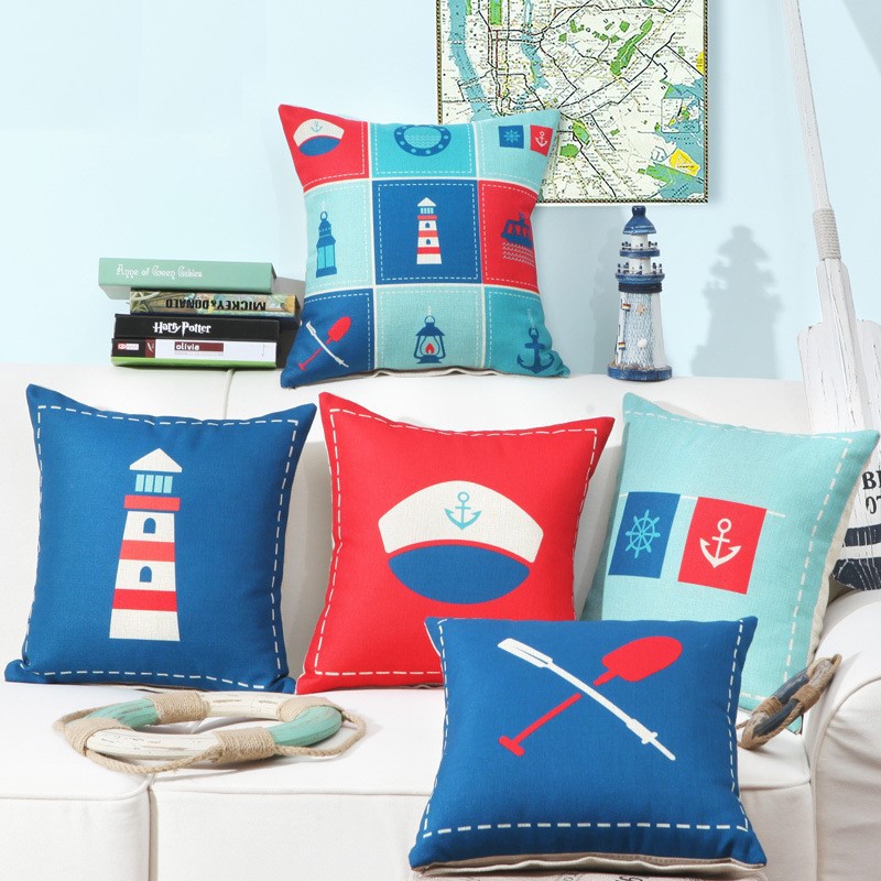 Gối Tựa Lưng Bố Gai Xanh Hải Dương Họa Tiết Biển Cả với tông xanh đỏ trắng xen kẽ, tạo nên cảm giác hài hòa, thoải mái, dễ chịu. Vỏ gối in hình ảnh quen thuộc về biển như: mũ hải quan, mái chào, ngọn hải đăng,...Biển cả quen thuộc gần bạn hơn bao giờ hết. Đặc biệt, với màu sắc sặc sỡ, các bé vô cùng thích thú.- Kích thước 45 x 45cm