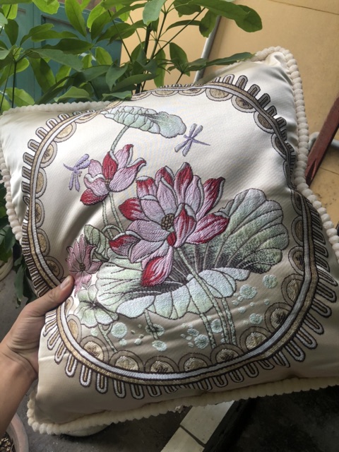 - Chất liệu vỏ ngoài bằng gấm, thêu họa tiết nổi hoa tỉ mỉ tạo cảm giác sang trọng cho căn phòng của bạn. Có thể tháo ra và giặt bằng máy giặt không sợ xù lông