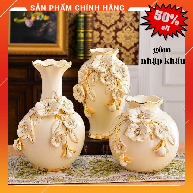 [GỐM NHẬP KHẨU ] Bộ 3 Lọ Hoa Gốm- Bình Cắm Bông Họa Tiết Hoa 3D Nổi -Mạ Vàng- Sang Chảnh,hàng nhập khẩu,đẹp,giá rẻ