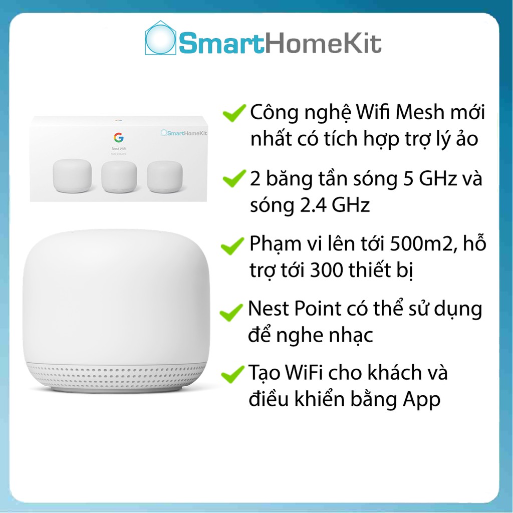 Google Nest Wifi kết nối với modem Wifi của bạn và tạo ra một mạng tín hiệu mạnh mẽ và đáng tin cậy. Nó có thể tự động cập nhật để có được các tính năng mới và giúp mạng của bạn được an toàn. Nest Wifi là một hệ thống Wi-Fi linh hoạt và có thể mở rộng. Các thiết bị Nest Wifi hoạt động cùng nhau để phủ kín toàn bộ ngôi nhà của bạn. Phạm vi phủ sóng lên tới 4400 ft2 .