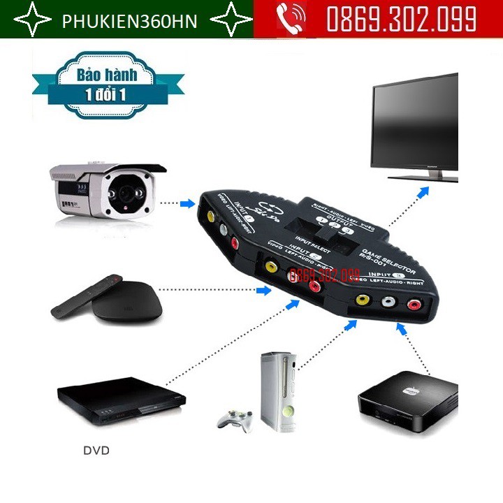 3 đầu vào tín hiệu AV 1 đầu ra tín hiệu AV cho bạn lựa chọn tín hiệu đầu vào qua công tắc.