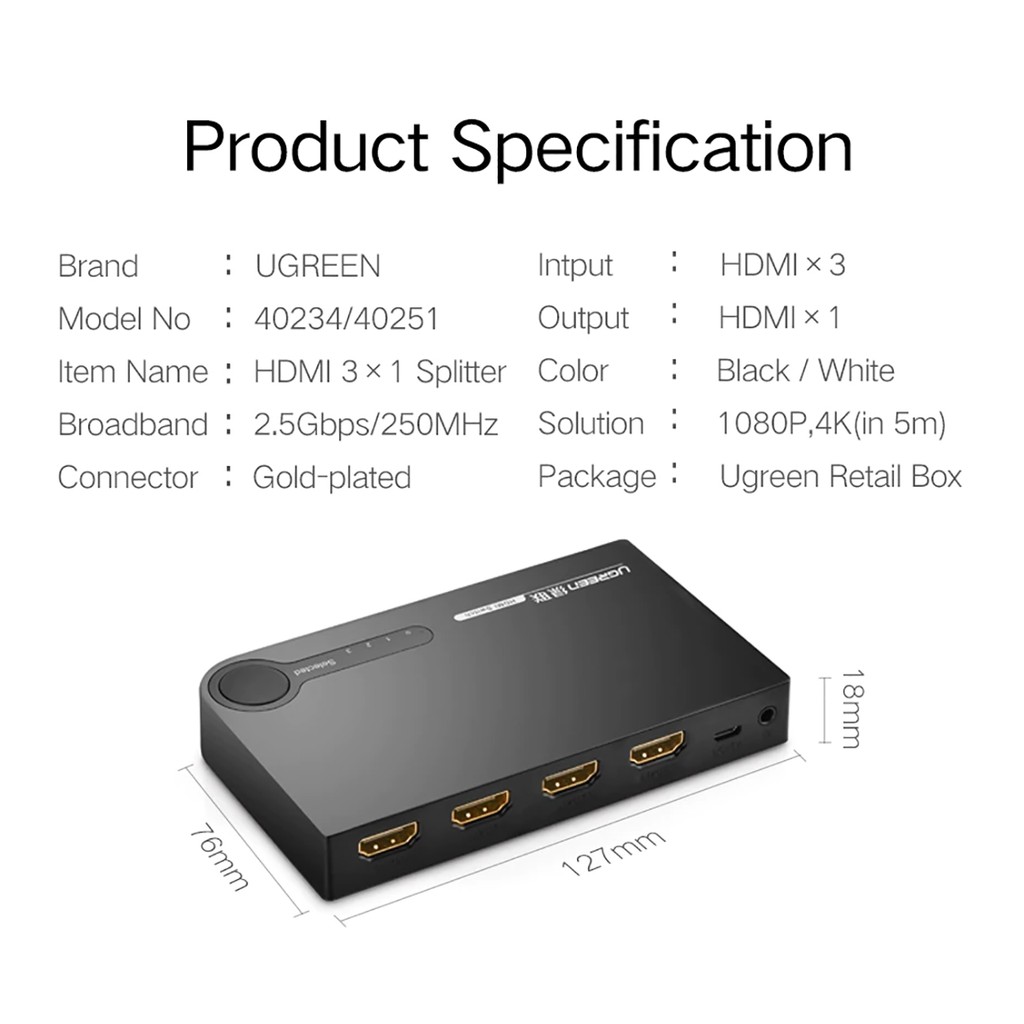 MÔ TẢ SẢN PHẨM :Bộ gộp tín hiệu HDMI cao cấp Ugreen 40234 là thiết bị tiện ích giúp bạn dễ dàng chia sẽ kết nối hình ảnh chuẩn HD từ 3 bộ phát như đầu đĩa, tv box, apple tv, đầu thu camera,... dùng chung 1 màn hình duy nhất, chuyển đổi kênh phát dễ dàng với 1 nút bấm hoặc sử dụng remote điều khiển từ xa tiện lợi.