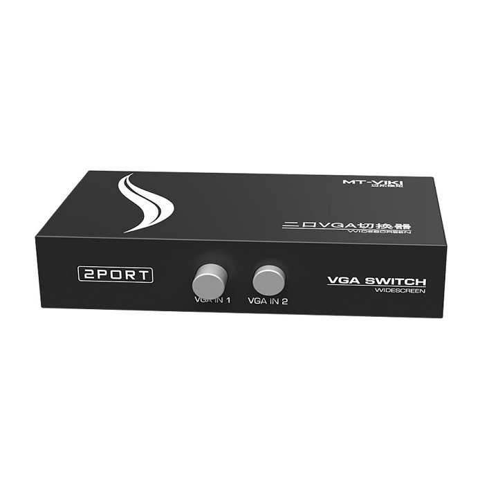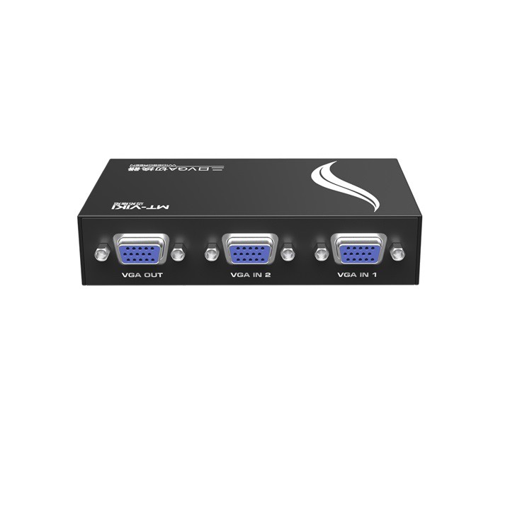 Bộ gộp tín hiệu VGA 2 vào 1 ra – VGA switch 2 in 1. Hai máy tính chia sẻ màn hình, 2 CPU qua 1 TV, 2 laptop sang 1 máy chiếu cổng VGA.Bộ gộp VGA 2 in 1 out là thiết bị hỗ trợ chuyển mạch tín hiệu từ 2 nguồn phát VGA chung 1 máy tính, máy chiếu thông qua cổng VGA. Hỗ trợ gộp tín hiệu với khả năng chọn nguồn phát thông qua nút bấm chọn kênh trên thiết bị.