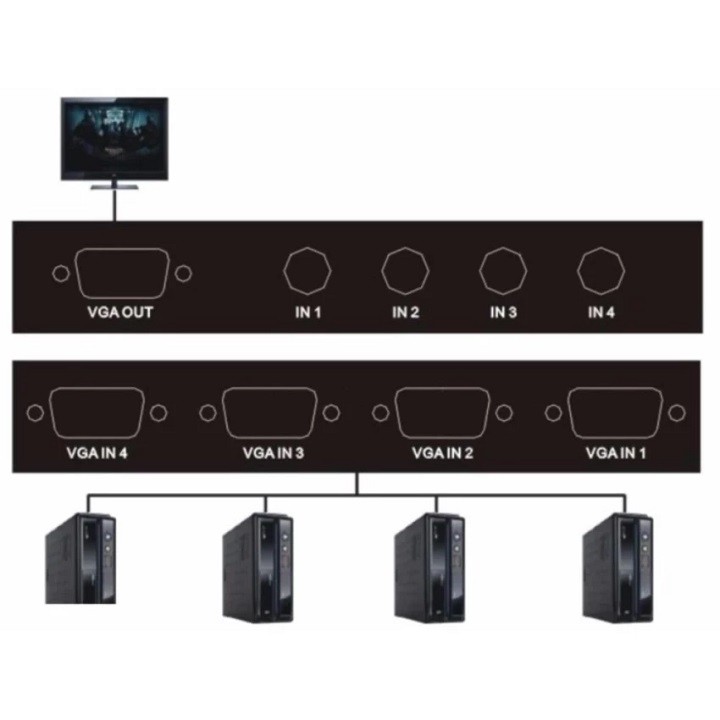 Bộ gộp VGA 4 vào 1 ra là thiết bị hỗ trợ chuyển mạch tín hiệu từ 4 nguồn phát VGA vào chung 1 màn hình, máy chiếu thông qua cổng VGA, hỗ trợ gộp tín hiệu với khả năng chọn nguồn phát thông qua nút bấm chọn kênh trên thiết bịBộ chia tín hiệu VGA 4 in 1 out dễ dàng sử dụng, bạn chỉ cần kết nối các thiết bị với nhau thông qua cáp VGA là có thể sử dụng, không cần cài đặt thêm phần mềm hay driver, không cần nguồn cấp điện ngoài