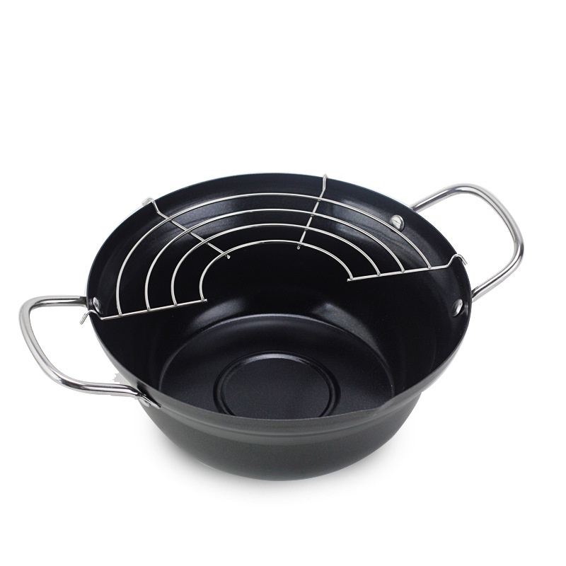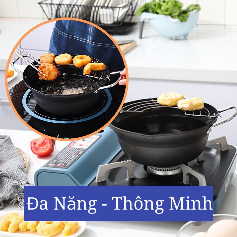 Chảo chống dính sâu lòng có thiết kế phần miệng giúp dễ dàng rót dầu thừa, kèm vỉ gác chảo giúp làm ráo dầu thức ăn rất tiện dụng.