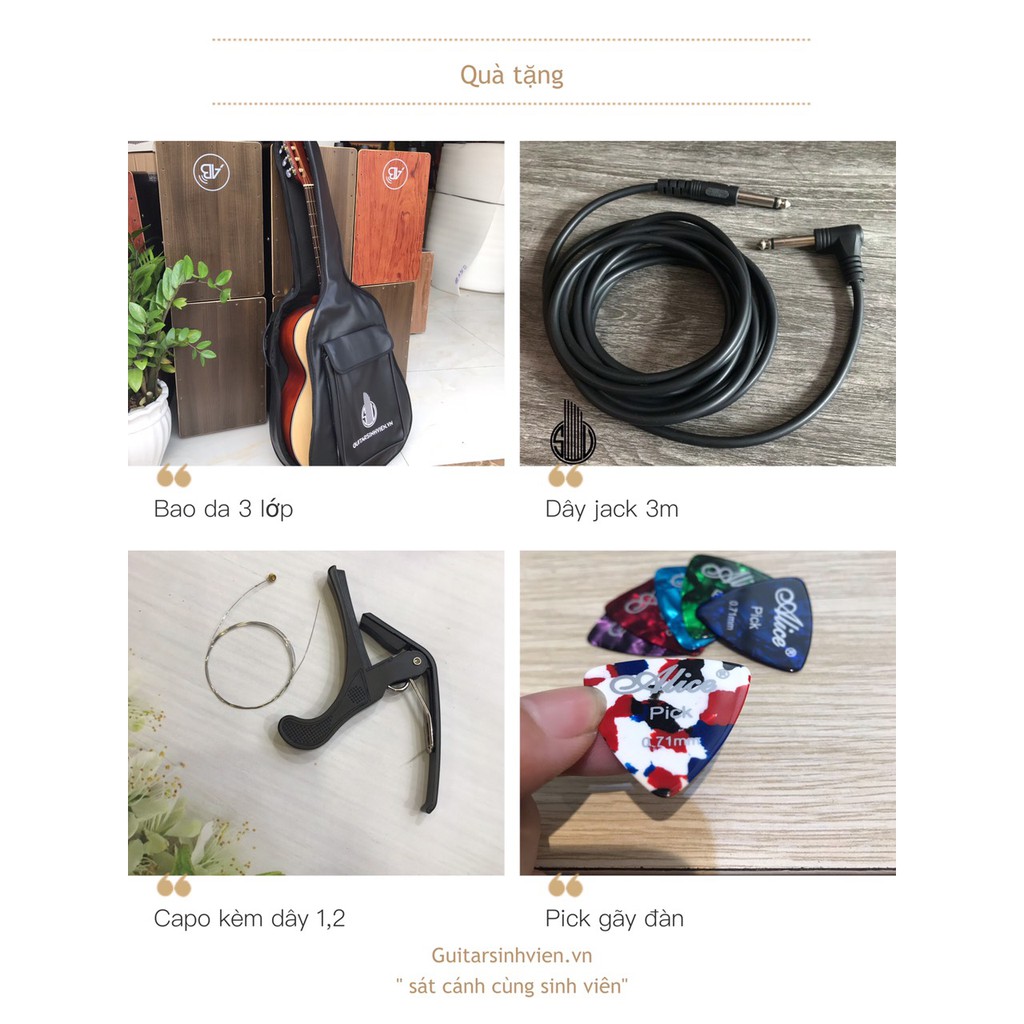 => Đã thế các bạn còn được tặng thêm: Tài liệu học, phím gảy, bao da 3 lớp, capo lên tông, dây 1,2, dây jack 3m kết nối loa, lục giác, miếng dán chống trầy.