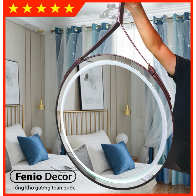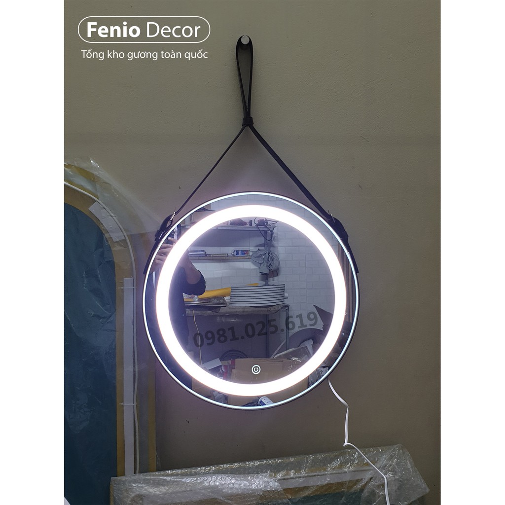 Gương dây da có đèn led treo tường Gương led cảm ứng hình tròn treo trang điểm decor phòng ngủ, phòng khách
