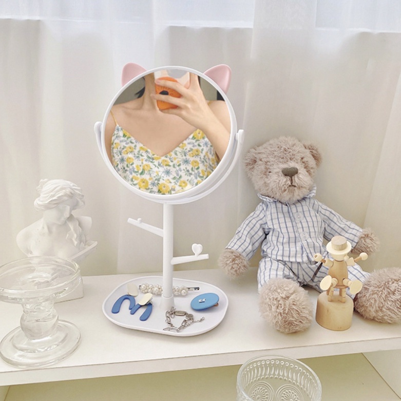 Gương Để bàn Tai Mèo Dễ Thương Kèm Móc Treo Phụ Kiện Xoay 360 Độ 2 Màu