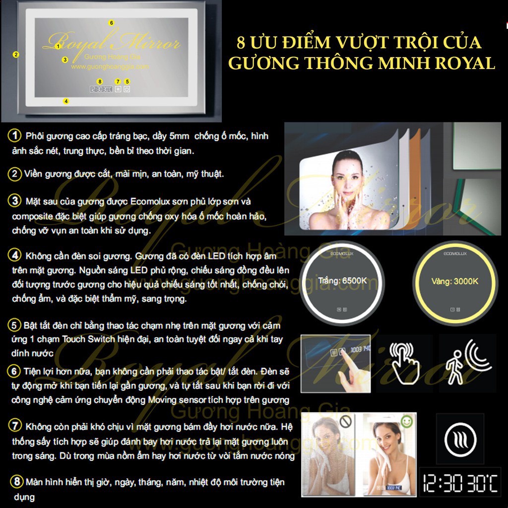 - Bằng công tắc cảm ứng chạm tay ngay trên mặt gương cực tiện dụng, an toàn, hiện đại.