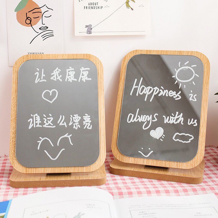 - Mẫu gương để bàn bằng gỗ còn được tặng kèm bút vẽ gương mực trắng, rất nhanh khô và dễ viết, cực kì độc đáo dành cho các bạn thỏa sức sáng tạo.
