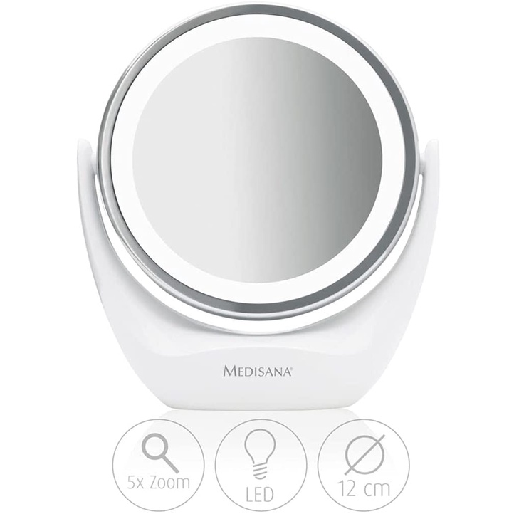 Gương Medisana 88554 CM 835 này làm cho thói quen chăm sóc da mặt hàng ngày của bạn trở nên dễ dàng hơn.Nó cung cấp hai mặt gương được chiếu sang,một phản chiếu hình ảnh của bạn ở kích thước band đầu và một mặt có độ phóng đại gấp 5 lần.Chúng ta có thể xoay 360 độ và theo bất kỳ hướng nào cần thiết khi sử dụng khớp xoay.Đèn chiếu sang khung không chói,bao gồm 12 đèn Led trắng có tuổi thọ cao,được bật và tắt bằng công tắc I/O