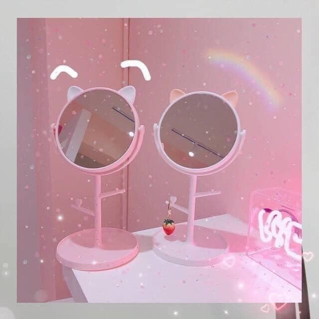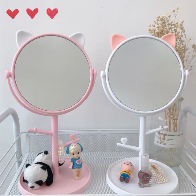 Gương trang điểm để bàn tai mèo có giá treo trang sức