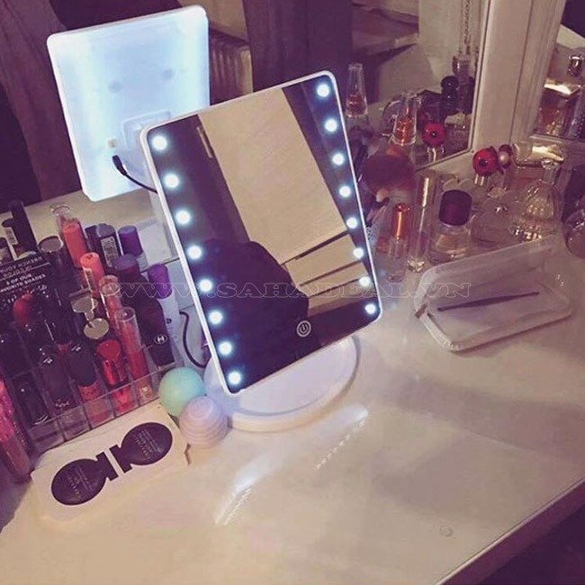 Gương trang điểm để bàn có đèn ledGương trang điểm để bàn có đèn led không giống như những chiếc gương bình thường mà nó có thể chiếu sáng trong bóng tối nhờ được gắn đèn LED, giúp bạn thấy rõ từng nét trên khuôn mặt trong điều kiện tối tăm nhất, từ đó trang điểm dễ dàng hơn ngay cả khi điều kiện ngoại cảnh không cho phép.