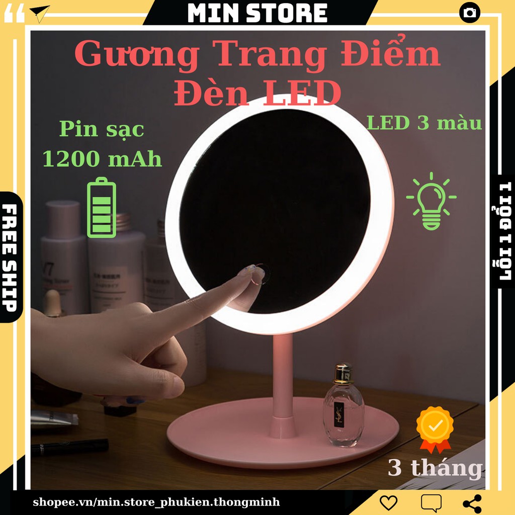 Gương Trang Điểm Có Đèn Led (Cao Cấp) Siêu Kute - Cảm Ứng - Pin Sạc 1200 mAh - Đèn 3 Màu - Tăng Giảm Sáng - Min STORE