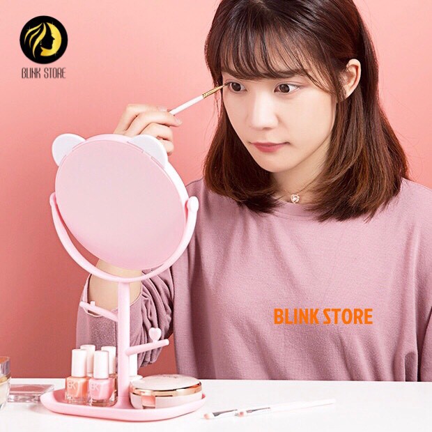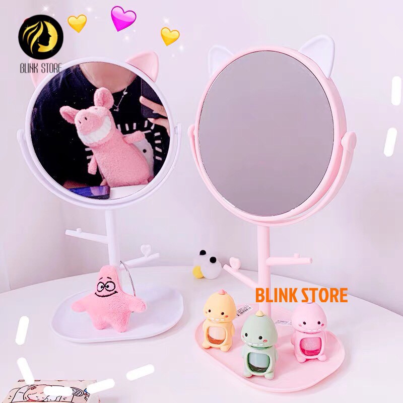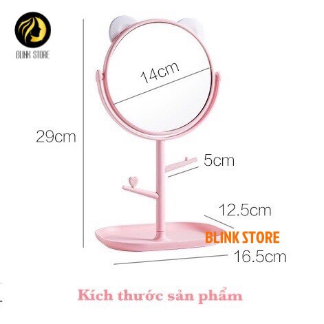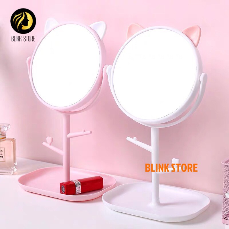 Gương trang điểm để bàn tai mèo đáng yêu 2 trong 1 kèm khay kệ trang sức mỹ phẩm tiện lợi