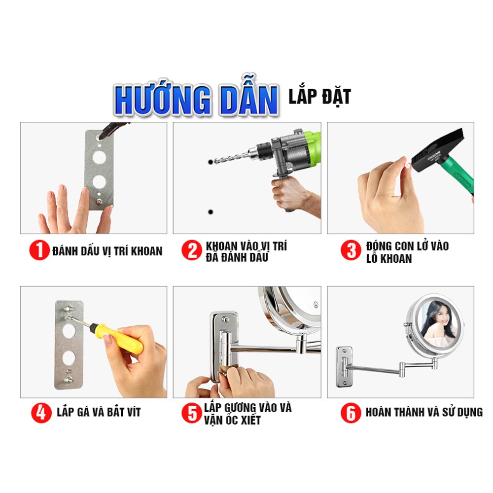 Dễ dàng lắp đặt, đi kèm với gương là vít và nở. Chỉ cần khoan 2 lỗ nhỏ bắt vít vào là xong