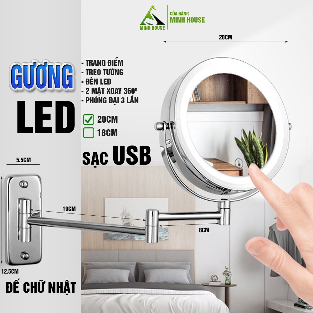 Gương trang điểm đèn LED phóng đại x3, xoay 360, 2 mặt, treo tường, đế chữ nhật Minh HouseLưu ý: Có nhiều mẫu, thông số như ảnh đại diện vui lòng chọn đúng.
