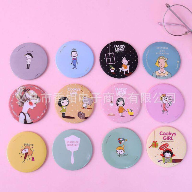 • Chiếc gương mini xinh xắn cho bạn gái, hình dạng tròn, hình vẽ dễ thương.