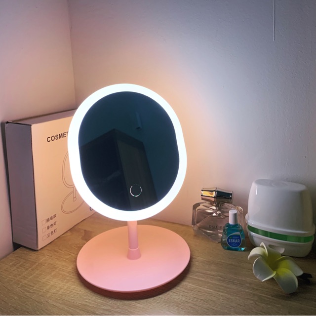 🍑 Gương soi để bàn có đèn LED quanh viền soi rõ từng lỗ chân lông luôn ạ :))Nút chạm cảm ứng trên gương chỉnh được ở 3 màu đèn: sáng trắng - sáng vàng - mix màu.