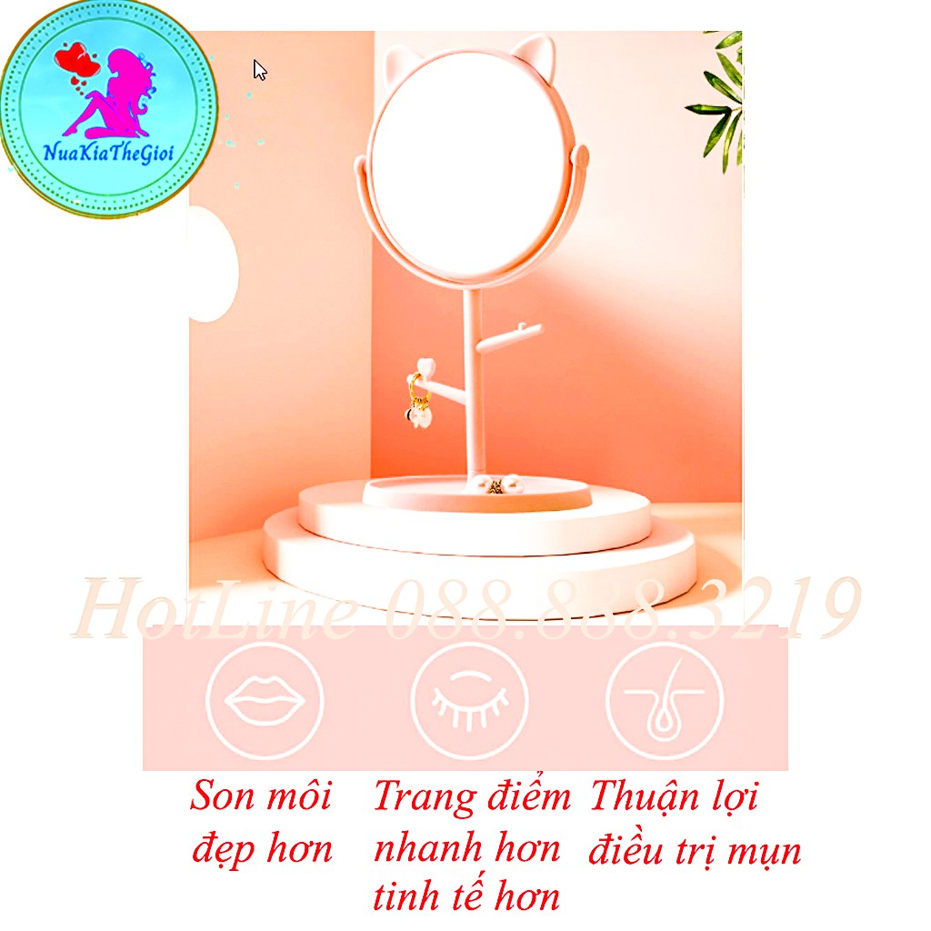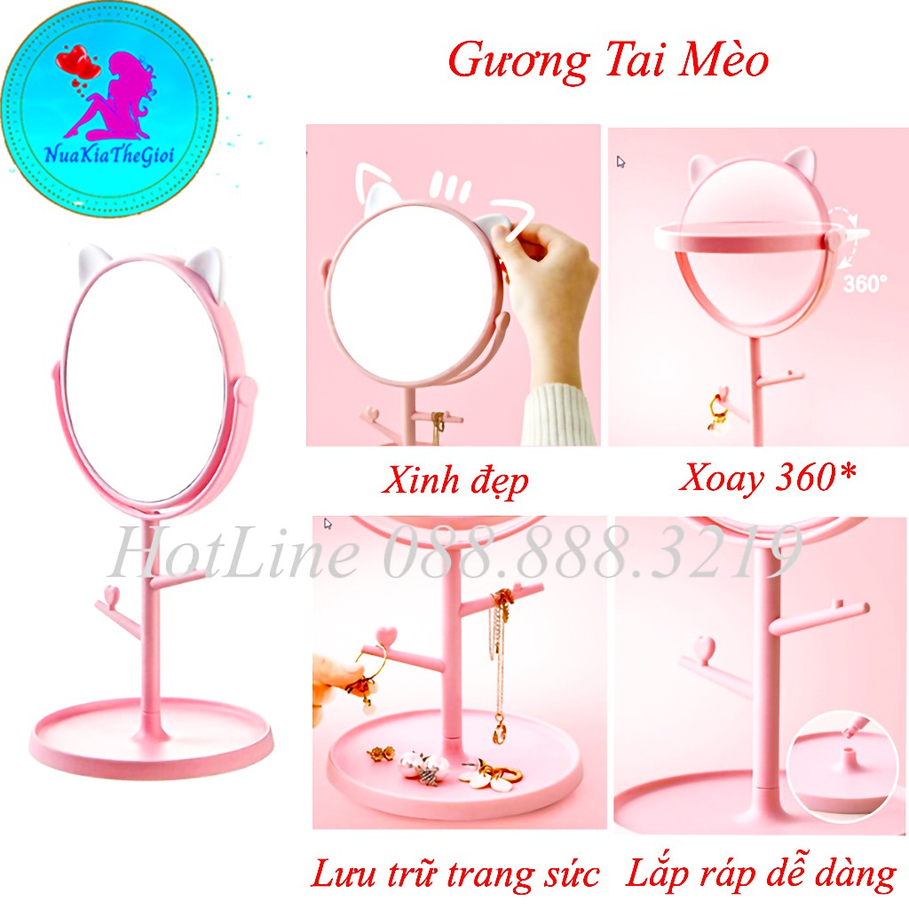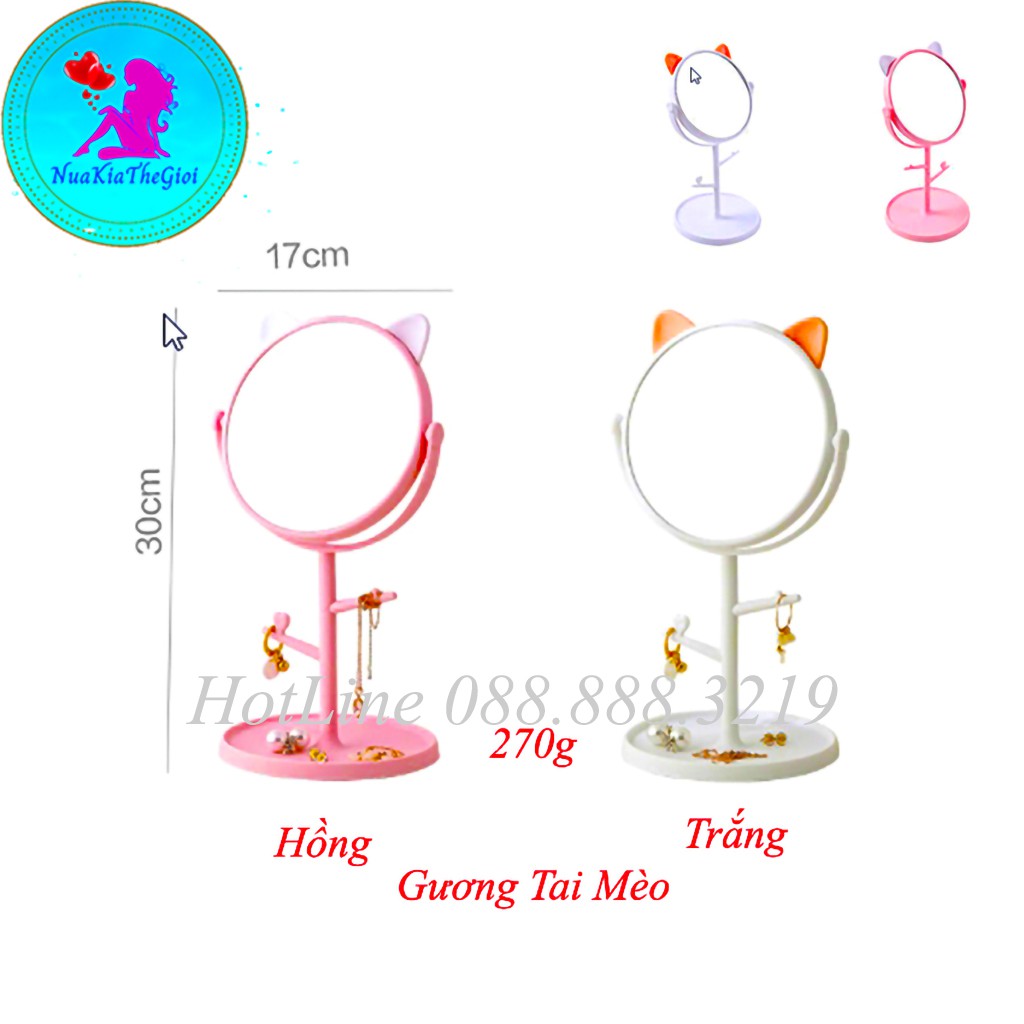 - Gương tai mèo để bàn tiện lợi cho các chị em trang điểm , vừa xinh với khuôn mặt, gương có các móc và đế gương để treo những đồ nhỏ nhắn, xinh xắn không lo bị rơi mất: khuyên tai, nhẫn, vòng…