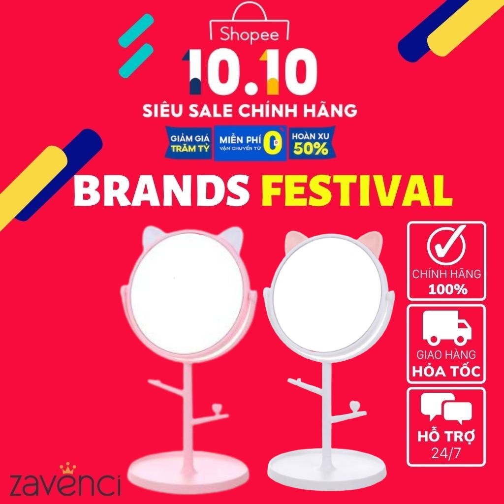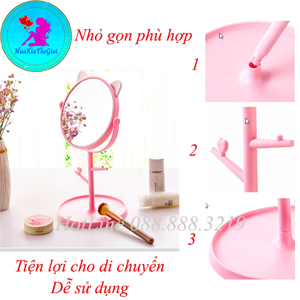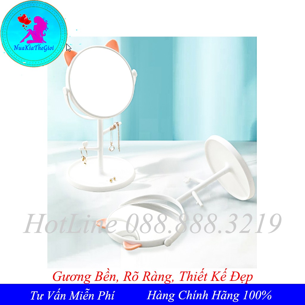 - Gương tai mèo để bàn tiện lợi cho các chị em trang điểm , vừa xinh với khuôn mặt, gương có các móc và đế gương để treo những đồ nhỏ nhắn, xinh xắn không lo bị rơi mất: khuyên tai, nhẫn, vòng…