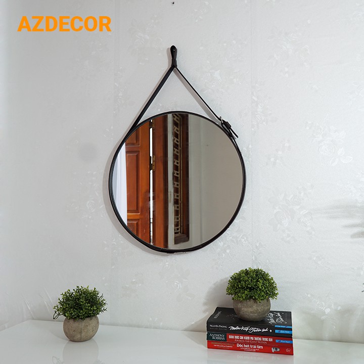 Gương treo tường tròn dây da Simili cao cấp kích thước D40 D50 D60 cho nhà tắm trang điểm phòng ngủ