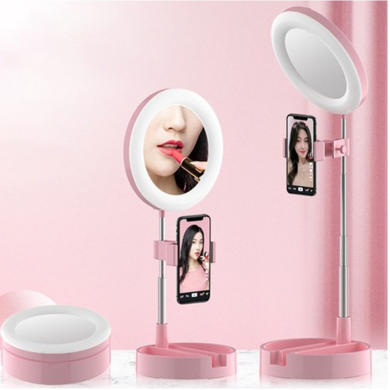 Gương Tròn Trang Điểm Có Đèn Led Trợ Sáng, Đèn Chỉnh 3 Màu, Tăng Giảm Chiều Cao, Gấp Gọn, Livestream, Tiktok, Bigo, FB