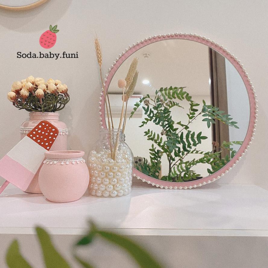 .. Gương tròn trang trí bàn trang điểm viền ngọc trai nhân tạo màu trắng hồng 30cm mã 002