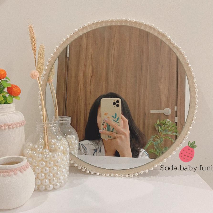 Giới thiệu .. Gương tròn trang trí bàn trang điểm viền ngọc trai nhân tạo màu trắng hồng 30cm mã 002