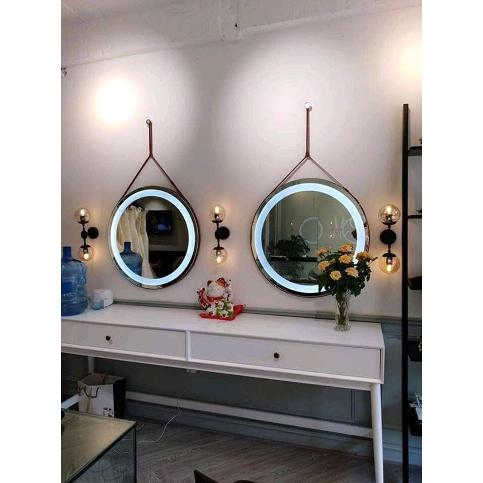 Gương tròn treo tường cảm ứng đèn led dây da bò đen nâu có ánh sáng trắng vàng cho nhà tắm phòng ngủ Gương Decordecor