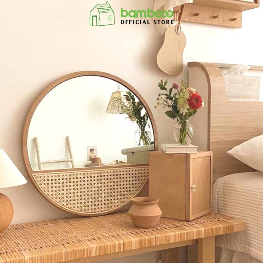 Gương vintage BAMBOOO ECO cao cấp phong cách Nhật Bản gỗ tần bì kết hợp sợi mây đan mắt cáo tự nhiên
