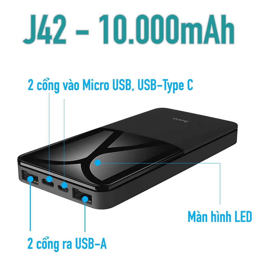 - Pin sạc dự phòng Hoco J42 dung lượng 10000mAh (hiệu suất sạc 60-70%), 2 cổng sạc nhanh
