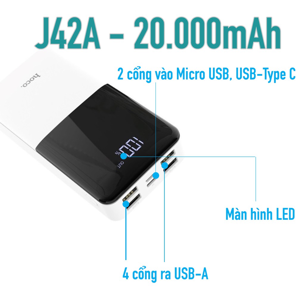 - Pin sạc dự phòng Hoco J42A dung lượng 20000mAh (hiệu suất sạc 60-70%), 4 cổng sạc