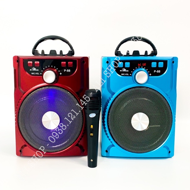 - Loa bluetooth, karaoke P88, tuy có thiết kế bên ngoài khác biệt nhưng tính năng của loa P88 cũng tương tự như mẫu P89, cũng vẫn hỗ trợ nghe nhạc qua kết nối không dây với các thiết bị, ngoài ra loa còn tích hợp thêm 2 cổng nghe nhạc từ USB và thẻ nhớ, P-88 còn có thêm cổng cắm mic có dây: chúng ta có thể dùng chức năng này cho việc đáp ứng các nhu cầu: đào tạo, bán hàng, quảng bá, hướng dẫn, ca hát giải trí ...