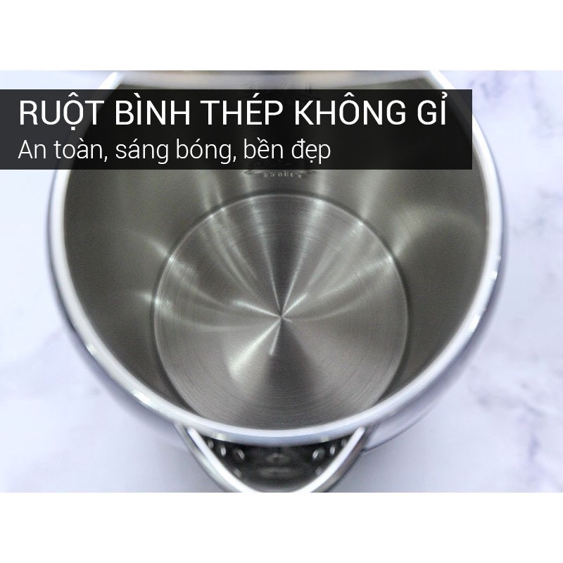 Công suất bình lên đến 1800W cùng mâm nhiệt phẳng giúp đun sôi nước trong thời gian ngắn, bạn không cần phải chờ đợi lâu đã có được bình nước nóng để sử dụng. Đế tiếp điện xoay 360 độ, thiết kế tháo rời tiện sử dụng, nhất là khi di chuyển. Dây điện có thể thu gọn dưới chân đế để bảo quản khi không dùng. Tay cầm được làm bằng chất liệu nhựa cách nhiệt mang đến cảm giác chắc chắn và hạn chế việc bị nóng tay khi nấu.