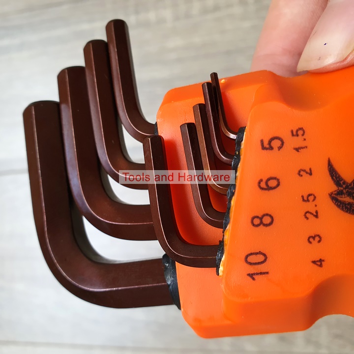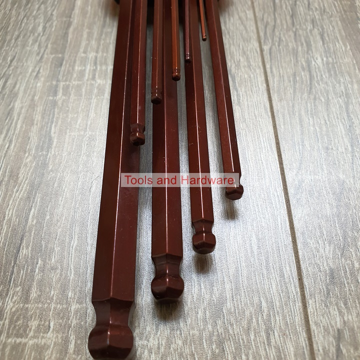 • Bộ lục giác bi dài gồm 9 cây lục giác: 1.5mm, 2mm, 2.5mm, 3mm, 4mm, 5mm, 6mm, 8mm,10mm