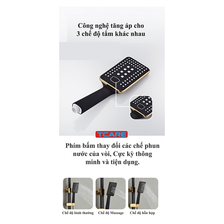 - Sản phẩm gồm 4 vòi: 4 chế độ tắm, riêng vòi tắm nghiêng có 3 chế độ phun nước: Hỗn hợp, Massage, Và bình thường.