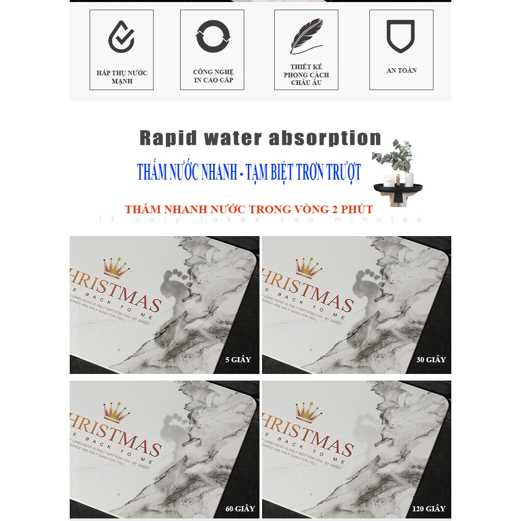 Nhờ có vô vàn lỗ nhỏ li ti trên bề mặt diatomite với đường kính 0,1 - 0,2 micromet nên thảm có khả năng thấm hút siêu nhanh và lập tức giải phóng lượng ẩm vào không khí khiến cho bề mặt thảm luôn khô ráo.Đây là sản phẩm cao cấp - Có độ dày chuẩn - Thấm hút tốt
