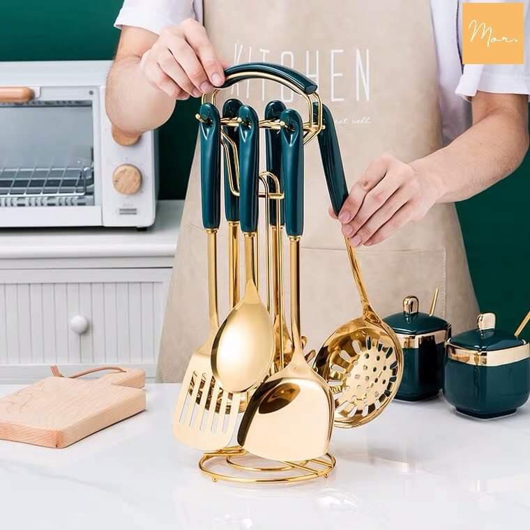 [ hàng chất ] Bộ môi thìa inox mạ vàng siêu xịn gồm 6 dụng cụ nấu ăn và giá treo muôi thìa cap cấp cán sứ