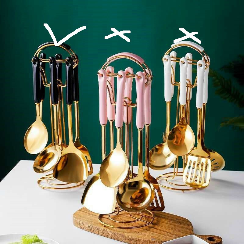 Nhà cửa & Đời sống > Bộ đồ bàn ăn > Bộ dao kéo || [ hàng chất ] Bộ môi thìa inox mạ vàng siêu xịn gồm 6 dụng cụ nấu ăn và giá treo muôi thìa cap cấp cán sứCòn hàng