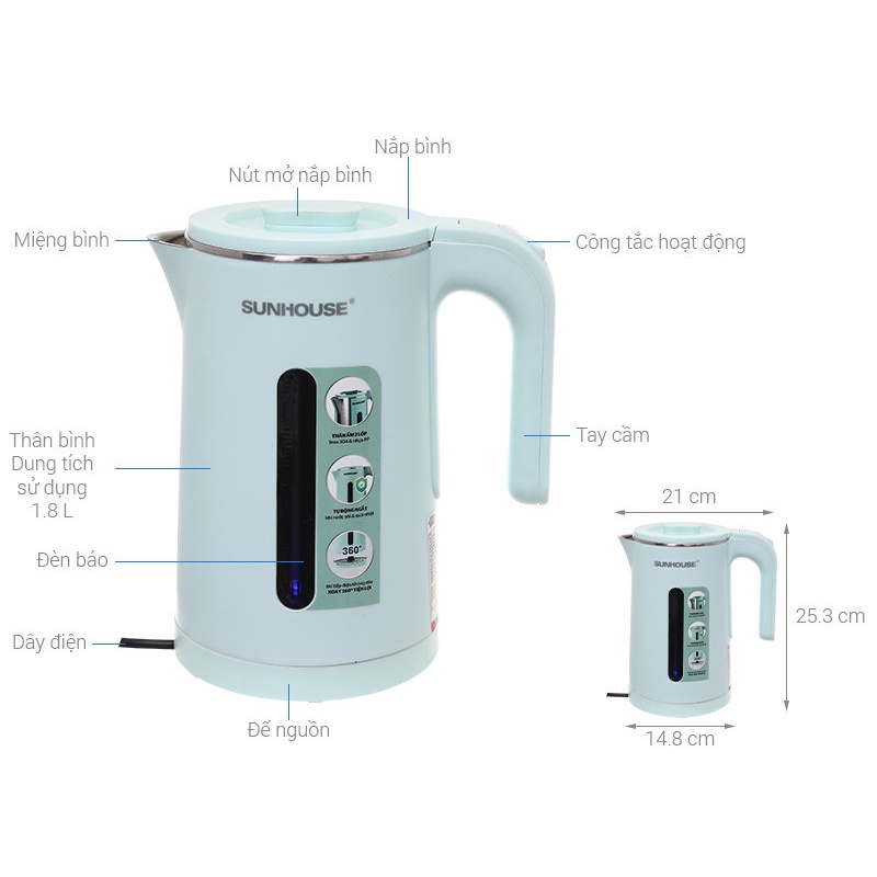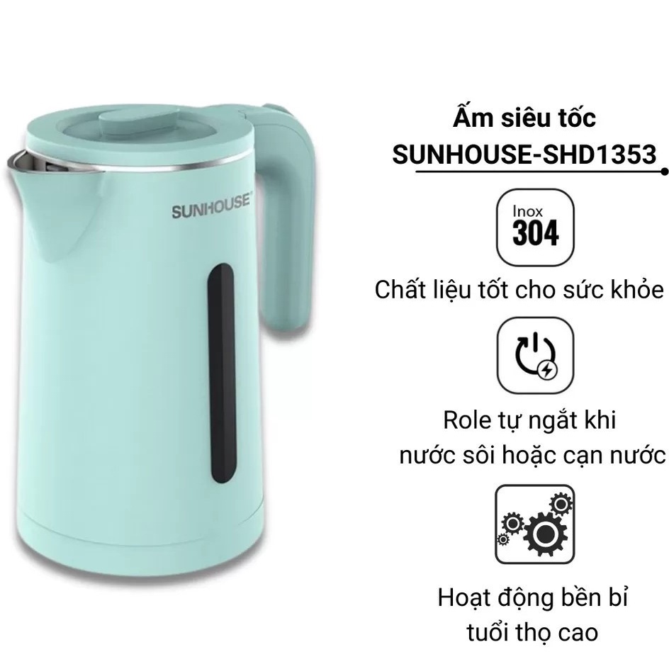 - Đặc biệt, ấm siêu tốc inox 304 2 lớp 1.8L SUNHOUSE SHD1351 còn được trang bị đèn báo hoạt động vừa tiện lợi, vừa tăng tính thẩm mỹ.