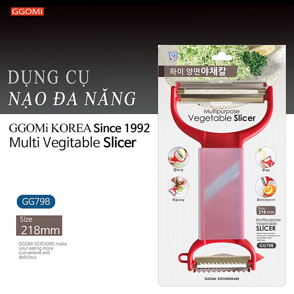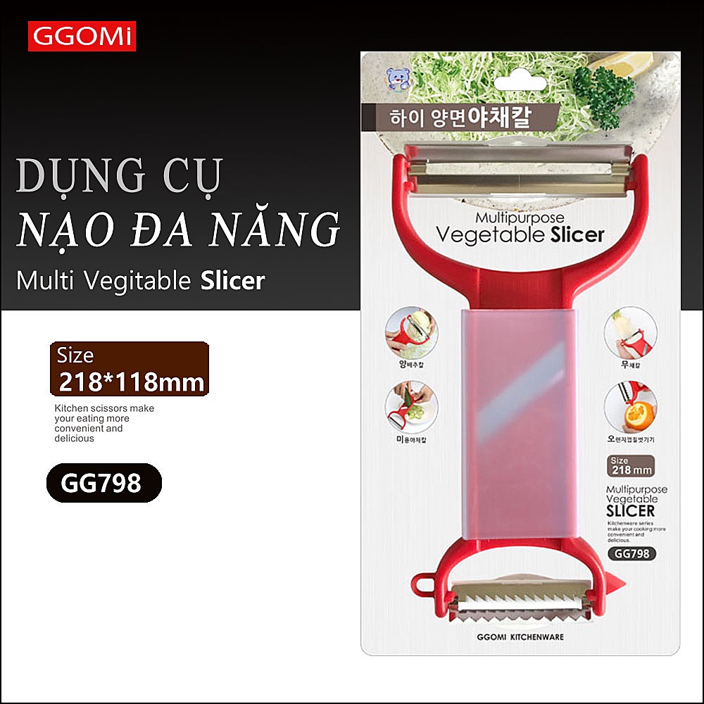 ✨Bào, nạo đa năng GGOMi Hàn Quốc GG798 có tay cầm bằng nhựa ABS tiện lợi sử dụng được cho người thuận cả tay trái lẫn tay phải, trên lưỡi dao được thiết kế dập nổi và in logo thương hiệu GGOMi tránh hàng nhái, hàng giả, lưỡi bào được sử dụng bằng vật liệu thép không gỉ an toàn với sức khỏe của con người khi sử dụng sản phẩm, ngoài ra sản phẩm còn có miếng nắp bảo vệ lưỡi bào vừa bảo quản vừa tránh được nguy hiểm khi không sử dụng. Sản phẩm sử dụng để bào nạo trái cây, củ quả để chế biến thực phẩm,....