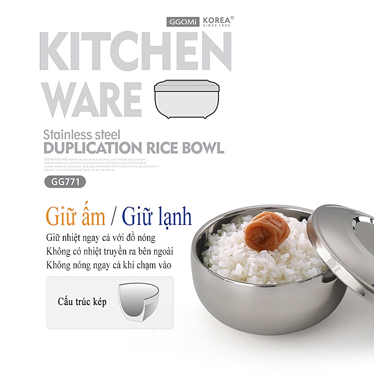 Giới thiệu [HÀNG CHÍNH HÃNG] Bát inox giữ nhiệt bằng thép không gỉ, hút chân không giữ thành và lòng bát của GGOMi Hàn Quốc