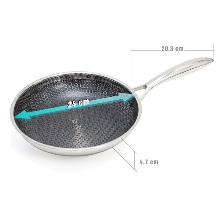CHẢO CHIÊN 24CM: Tay cầm dài | đáy dày 0.33cm | trọng lượng 0.8 kg | không nắp kính