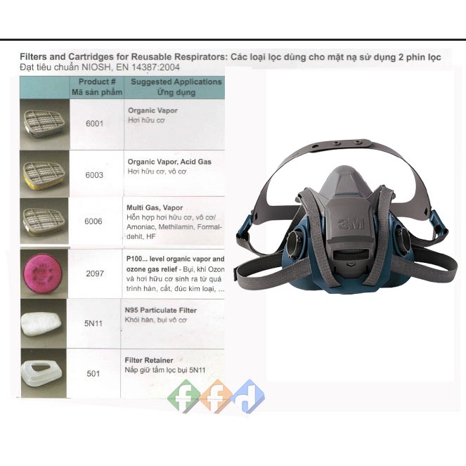 +Lọc hơi/khí độc kết hợp lọc bụi: MẶT NẠ + 2 PHIN LỌC + 2 TẤM LỌC BỤI 3M 5N11 + 2 NẮP GIỮ TẤM LỌC 3M 501