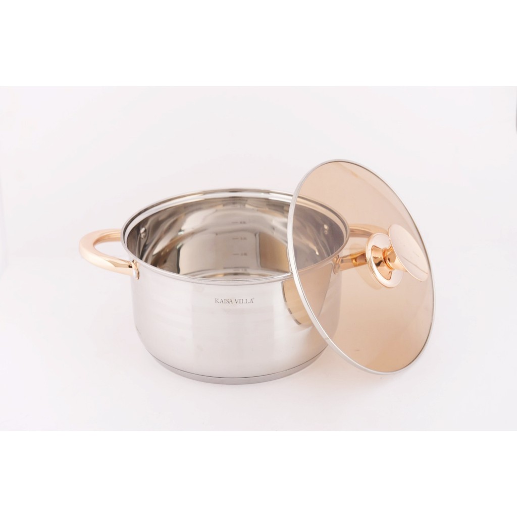 Bộ nồi inox 5 đáy 6 chiếc Kaisa Villa có nắp đậy bằng thủy tinh cao cấp, có độ bền cao, thiết kế trong suốt hiển thị thực phẩm bên trong khi đun nấu.