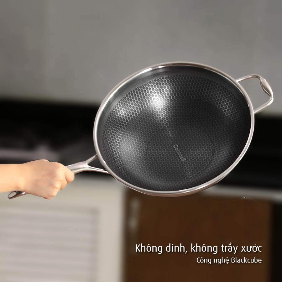 • Thân đa lớp inox với BLACKCUBE mới nhất Hàn Quốc. Kỹ thuật khắc Blackcube tạo ra nhiều trụ nhỏ inox che chắn lớp chống dính nên chống trầy xước