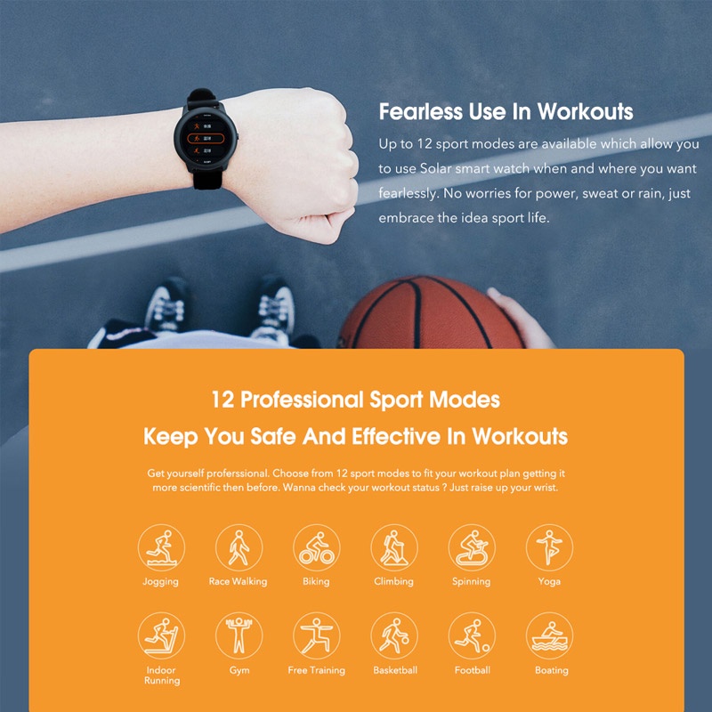 Chế độ thể thao: Jogging, fast walking, biking, climbing, running indoor, spinning, yoga, gym, free training, basketball, football and boating