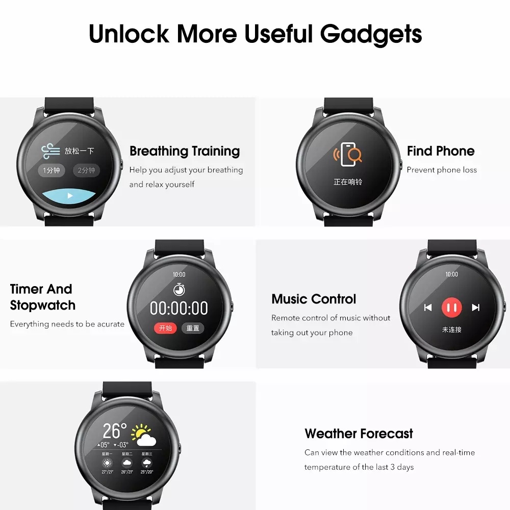 Ngoài ra ở chiếc đồng hồ này còn có các chức năng luyện thở, tìm điện thoại, hẹn giờ và bấm giờ, điều khiển nhạc, hiển thị dự báo thời tiết trong ba ngày.